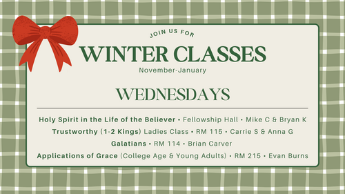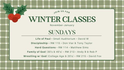 We encourage all our members to join a Bible study on Sundays at 9am and Wednesdays at 6:30pm. Signs within the building point the way towards these classes.